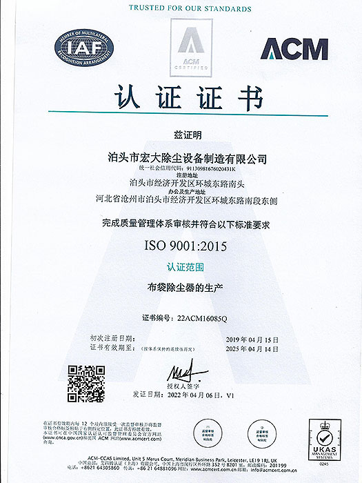 宏大ISO 9001認證證書-宏大除塵設備