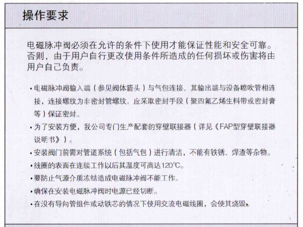 工作壓力:0.4~0.7, 環(huán)境溫度:-10~55(℃), 使用介質(zhì):清潔空氣, 膜片壽命:噴吹100萬次以上。