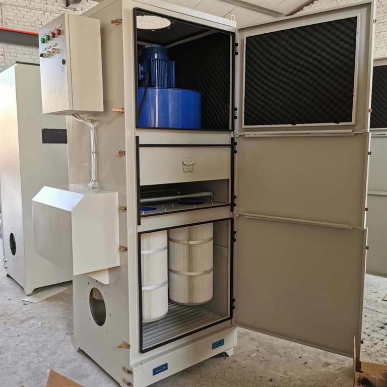 作業原理:含塵氣體由進氣口進入灰斗或打開法蘭口進入過濾室,含塵氣體透過濾筒過濾為凈化氣進入凈化室,再經凈化室排氣口,由風機排走。粉塵積附在濾筒的外表面,且不斷添加,使除塵器的阻力