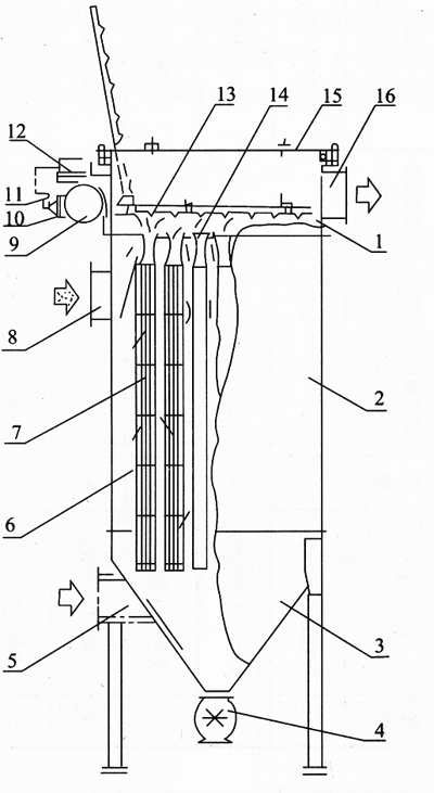 鋼板倉負壓脈沖除塵器本實用新型公開了一種負壓脈沖除塵裝置,包括除塵室,脈沖裝置,灰斗室,進煙口和出煙口,所述脈沖裝置設置在除塵室的上方,所述除塵室與脈沖裝置之間設有隔板,所述除塵室與灰斗室相連通,所述除塵室內設有旋轉布袋除塵架。